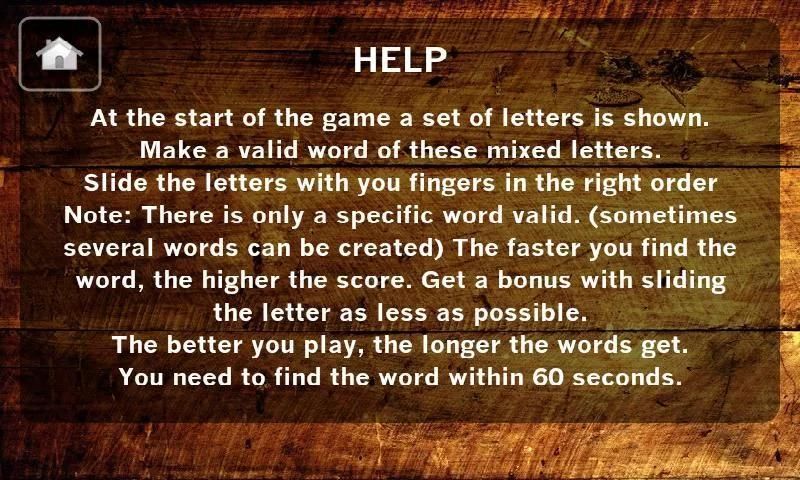 खेल के शुरू में पत्र का एक सेट दिखाया गया है. इन मिश्रित पत्र की एक वैध शब्द बनाओ. एक वैध शब्द को सही क्रम में आप उंगलियों के साथ पत्र स्लाइड.
