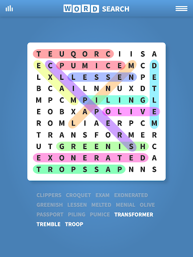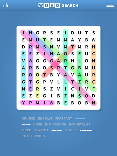 आपका लक्ष्य ग्रिड में छिपी हुई शब्दों की सूची का पता लगाना है। शब्दों को क्षैतिजीय, ऊर्ध्वाधर, तिरछे या पीछे की ओर खोजा जा सकता है। शब्द एक बार मिल जाने पर ग्रिड में शब्दों का चयन करने के लिए, शब्द के पहले अक्षर से शुरू करके, स्वाइप करें तथा ड्रैग करें। एक जुड़ी हुई चुनौती के लिए हमारे विशिष्ट कठिन तथा