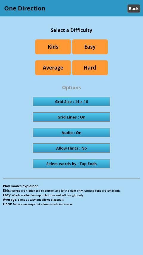 आप शब्दों को छिपा रहे हैं कि कैसे चुनकर कठिनाई नियंत्रण तुम खेल आसान बनाना चाहते हैं, तो रिवर्स शब्द या विकर्ण अक्षम करें.