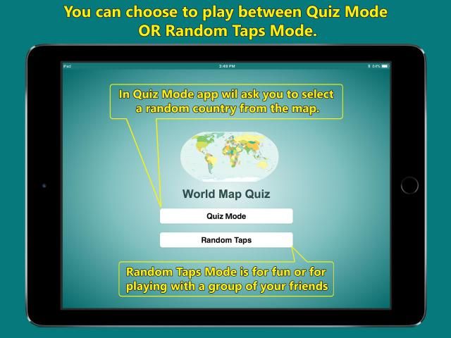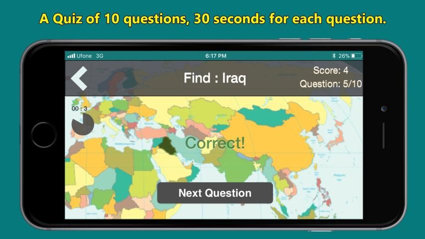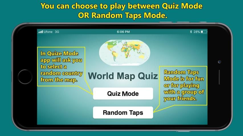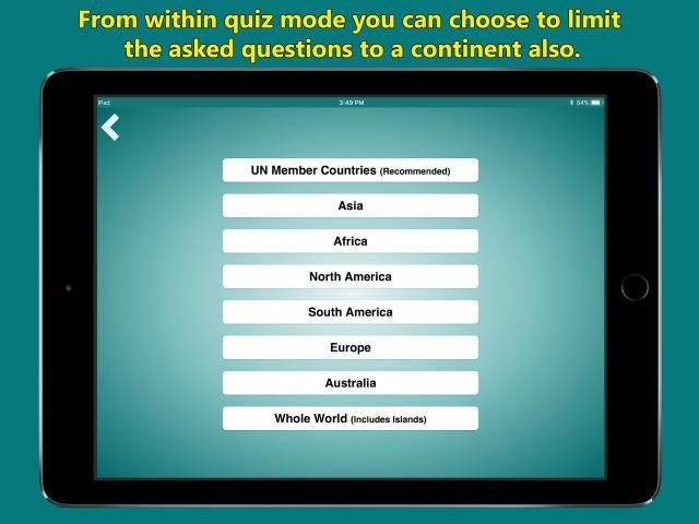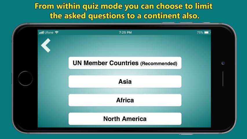 Quiz mode is based on 10 questions for each session, user is asked to select a random country on the world map. Quiz mode can further be played for continents, UN Member Nations and the whole world.