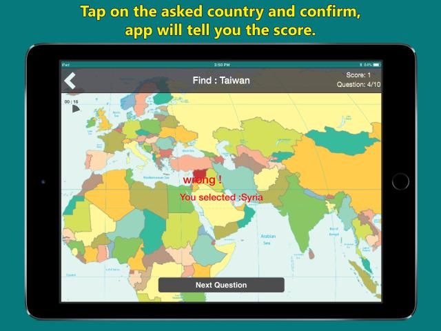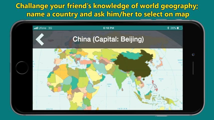 Random Tap mode is just for playing in pairs or can also be used by individual user’s personal knowledge testing. In this mode user just has to tap on a county in the map, app will tell the country name.