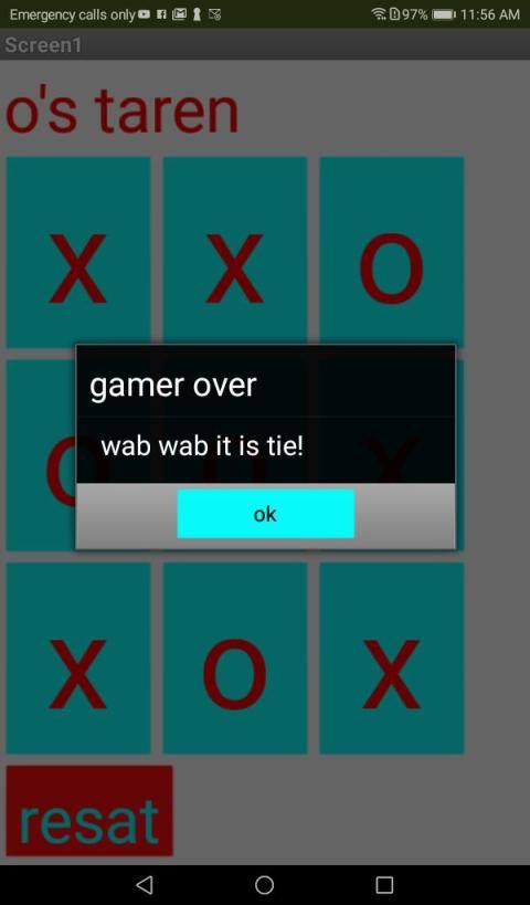 duple play game . you meed to continue a row formed of three digits vertically or horizontally or curved line to win the game . one person plays with (x) the other plays with (o) if no one finishes a row(three (x) or three(o)forming a row ) its a tie so play another game . you can use the reset button any time to restart your game .