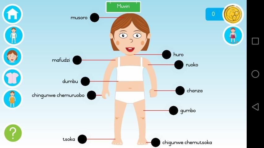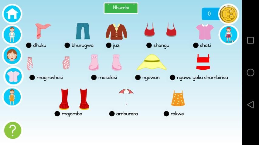 Shona Wardrobe is an Shona educational app for young children that teaches them the names (and pronunciation) for different body parts, clothing and weather.