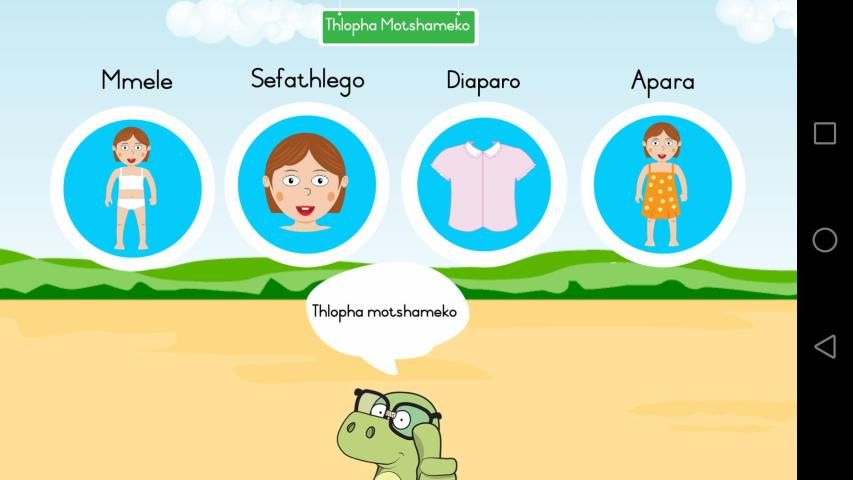 Tswana Wardrobe is an Tswana educational app for young children that teaches them the names (and pronunciation) for different body parts, clothing and weather.