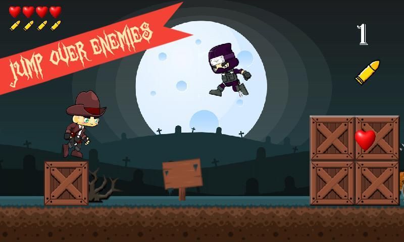 Now, you will not escape from the monsters, you will run against them. The main hero jumps over the zombies and monsters, and tries to catch hearts and "back time" in order to run more distance. In addition, he can shoot the obstacles and zombies by collecting the bullets.