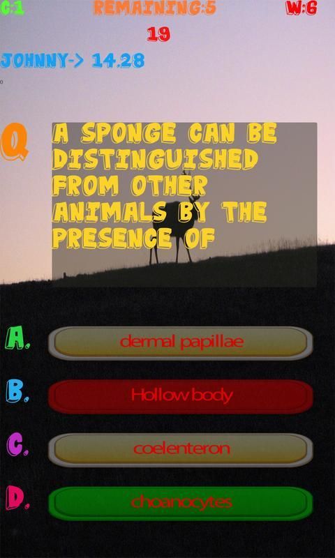 This Zoology game helps user to sharpening their knowledge and senses, help them to prepare for exams or tests which are based on all branches of Zoology and helps them to increase their knowledge. This app targets people of all ages, even children could enjoy tests created by this app and could enhance their Zoology Knowledge. This app can be used for the preparation of School, Collage and Universities quizzes and also for entry tests. This app contains cool features like coloring the buttons green if the answer is correct otherwise coloring the button red because the answer is wrong. It provides multi-player functionality which enables you to play against the players around the world. It contains good graphics and less Ads. This app is extremely efficient, it is developed in such a way so that it could run smoothly in any android device.