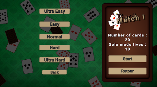 प्रसिद्ध कार्ड मैच गेम अब आपके मोबाइल डिवाइस पर सुखदायक संगीत के साथ खेलने के लिए स्वतंत्र है।यह गेम आपकी याददाश्त में सुधार करने में मदद करता है और अल्ट्रा आसान से अल्ट्रा कड़ी मेहनत में मदद करता है, जिससे आप 5 अलग-अलग कठिनाइयों से चुनते हैं जो जोड़े की संख्या को प्रभावित करते हैं और कोशिश करते हैं।यह विस्तृत किस्म सभी उम्र के लिए चुनौती को आकर्षक बनाता है!सीमित संख्या में कोशिशों के साथ अकेले खेलें, दोस्तों के साथ स्थानीय रूप से प्रतिस्पर्धा करें, या इस मेमोरी रेस के साथ एआई पर जाएं!