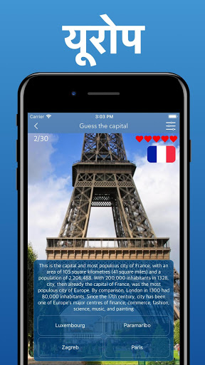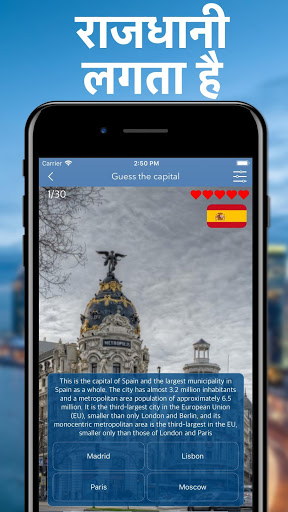 क्या आप यूरोपीय देशों की राजधानियों को जानते हैं? अफ्रीका या एशिया की राजधानियाँ? क्या आप जानते हैं कि ओस्लो राजधानी और नॉर्वे का सबसे बड़ा शहर है, और वारसॉ पोलैंड की राजधानी और सबसे बड़ा शहर है? भूगोल के बारे में इस मुफ्त आवेदन के साथ आप दुनिया के सभी देशों की राजधानी के सभी शहरों को जान सकते हैं! अपने भूगोल ज्ञान का परीक्षण करें! दुनिया के सभी देशों की राजधानियों का अनुमान!