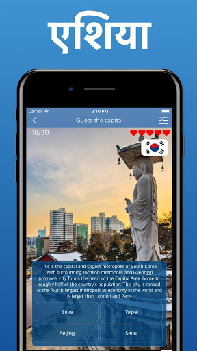 यह भूगोल में रुचि रखने वाले किसी भी व्यक्ति के लिए एक महान शैक्षिक खेल है। दुनिया के सभी देशों की राजधानी के शहरों का अनुमान है! अपने ज्ञान का परीक्षण!