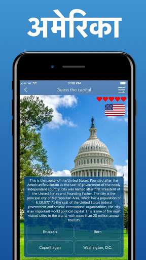 क्या आप अर्जेंटीना की राजधानी जानते हैं? स्विट्जरलैंड की राजधानी कौन सा शहर है? इस मुफ्त आवेदन में आपको दुनिया के सभी देश, दुनिया की सभी राजधानियां मिलेंगी!