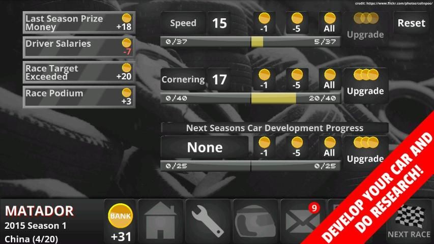 * Manage your accounts, upgrade your car, invest in Research and Development