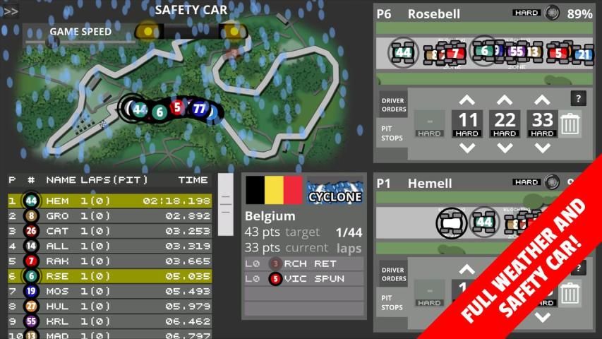 * 5 race weather systems (Clear, Cloudy, Drizzle, Rain, Storm, Cyclone)