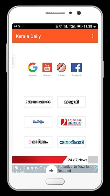 सभी प्रमुख मलयालम समाचार पत्र सहित इस एप्लिकेशन को। आप बस एक क्लिक में इस खबर अद्यतन पहुँच सकते हैं। और वहाँ कुछ अन्य उपयोगी विकल्प इस एप्लिकेशन के साथ जुड़ी हुई है। उपयोगकर्ता सीधे गूगल, यूट्यूब, फेसबुक पर जा सकते हैं,