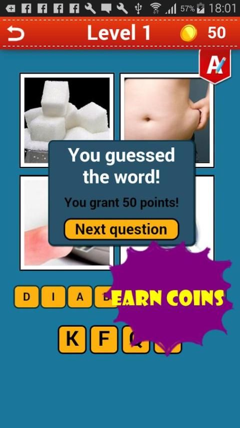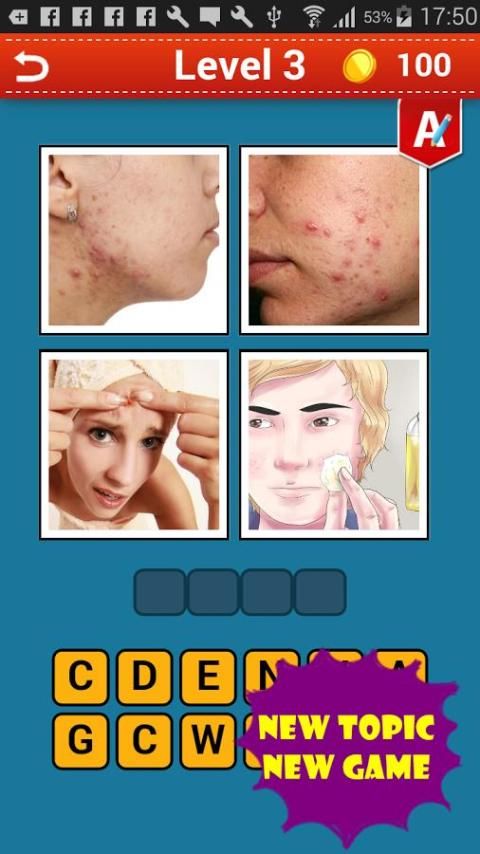 4 Pics 1 रोग एक शब्द और चित्र खेल में आप बीमारी या लक्षण 4 छवियों में वर्णित लगता है के लिए है, यह अपनी स्मृति और शब्दावली कौशल के परीक्षण के लिए एक प्रश्नोत्तरी है।