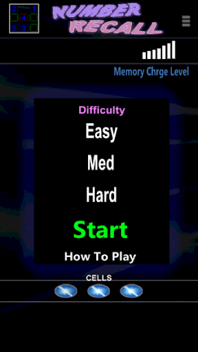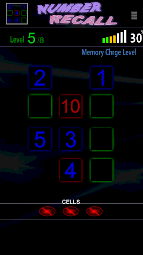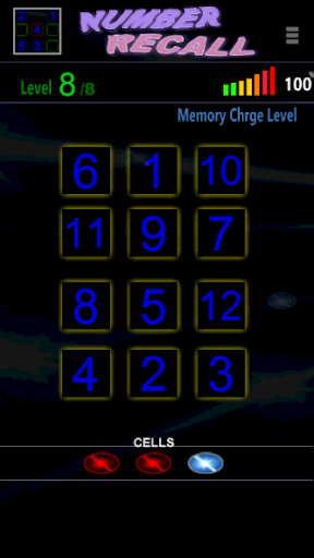 Number Recall is designed to push your memory skills to the limit. Use your memory to remember where each number is in the right order. You have a set time to start before the numbers will vanish of screen. Touch the buttons in number order to recall in the correct order.