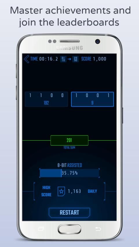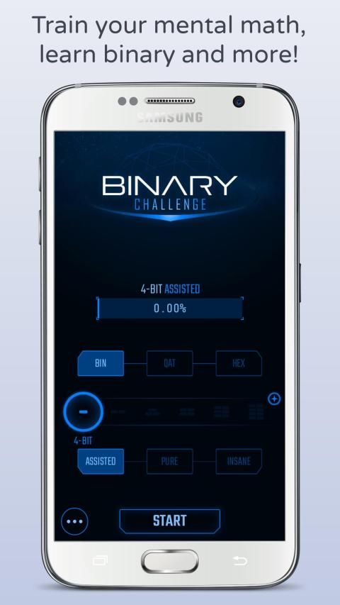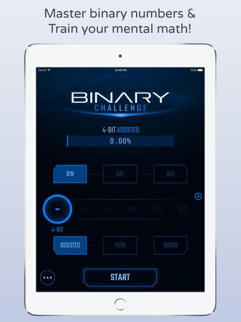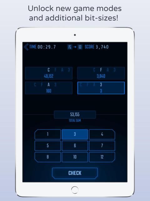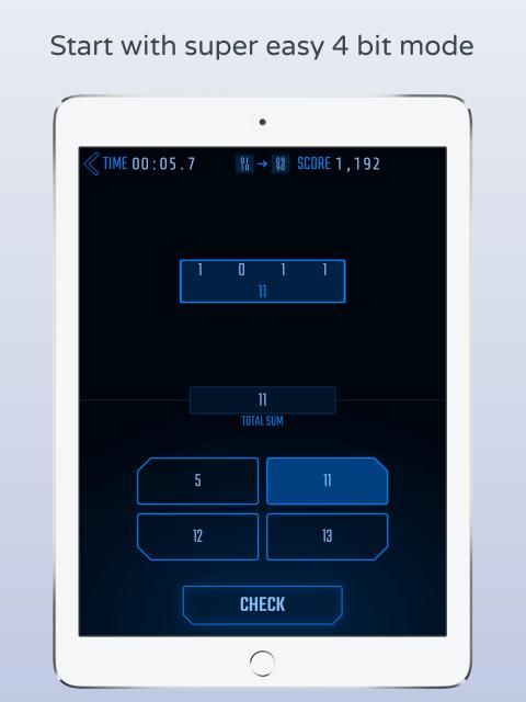 You start in super easy 4-bit binary mode and choose your result from suggestions. Discover new game modes, more numeral systems and advance to larger bit-sizes by mastering each level. We’ve included "Pure" and "Insane" mode where you calculate the exact result, hexadecimal numbers, and numbers with up to 32-bit. The faster you convert the numbers, the higher your score. Earn your place in our leaderboards and compare with your friends! Are you ready for the Binary Challenge™?
