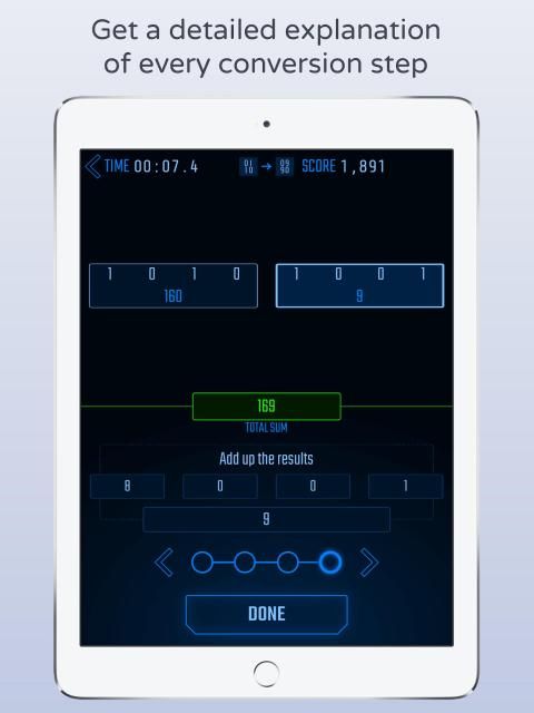 Binary Challenge™ drives you to convert binary (and hexadecimal) numbers to the decimal system by mental math faster and faster. Dive into the meditative “deep space” atmosphere to enhance your concentration and enter flow.