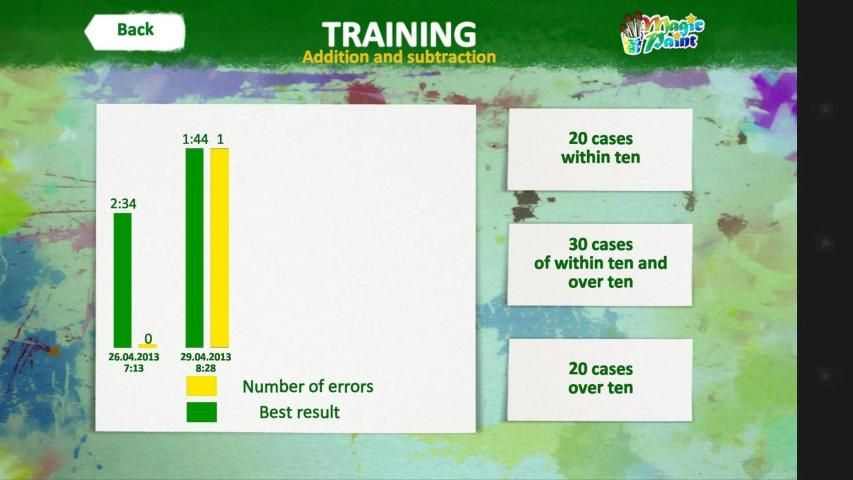 “Training” is an easy-to-handle tool for effective instruction of your child. Forget about countless slips of paper with cases written on them! Everything is right here: addition, subtraction, multiplication and division. After solving the problem the results are saved and can be seen on the stats page, the graph represents the results and the number of errors. This helps to track the dynamics of learning.