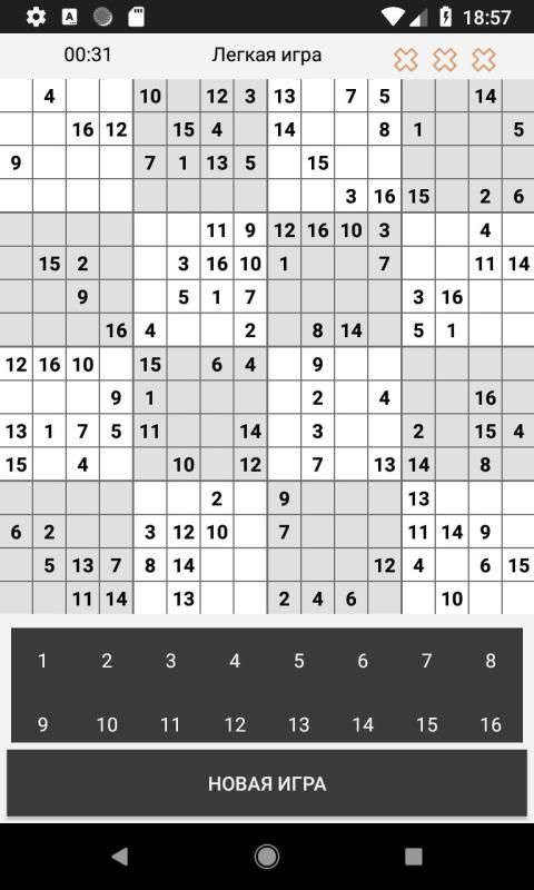 Вы можете играть в классический Судоку 3x3 или выбрать расширенный вариант судоку в котором игровое поле представляет собой квадрат размером 16x16.