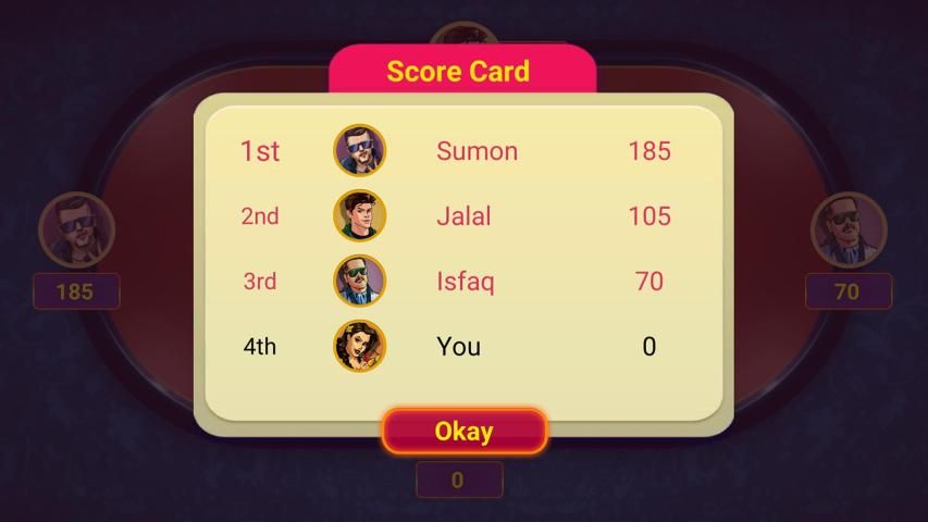 একটা রাউন্ড এর খেলা শেষ হলে পয়েন্ট গোনা হবে। এক রাউন্ড এর সর্বমোট ৩৬০ পয়েন্ট থাকে। এর পর শুরু হবে সেকেন্ড রাউন্ড। আর এভাবেই চলতে থাকে , যতক্ষণ না কোন প্লেয়ার ১০০০ পর্যন্ত যায় । আর একই রাউন্ড এ দুই প্লেয়ার ১০০০ পয়েন্ট হলে যার বেশী সে জিতবে।