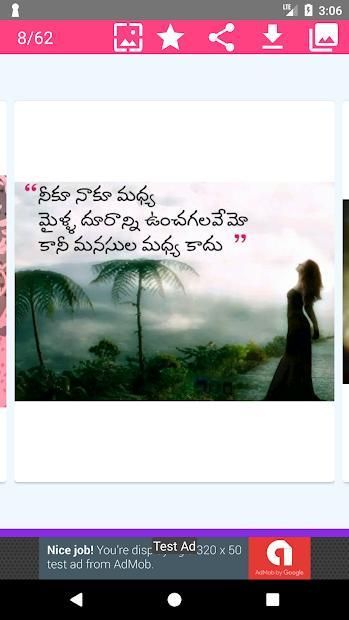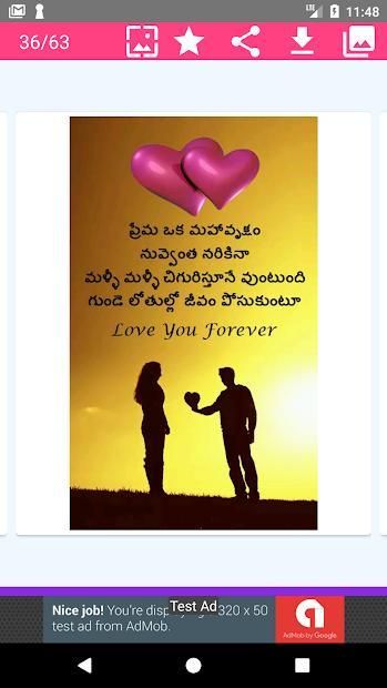 Banyak kutipan cinta cinta romantis dan hati atau kutipan prema kavithalu tersedia. Simpan gambar kutipan cinta telugu Anda langsung kartu SD atau Galeri Telepon.