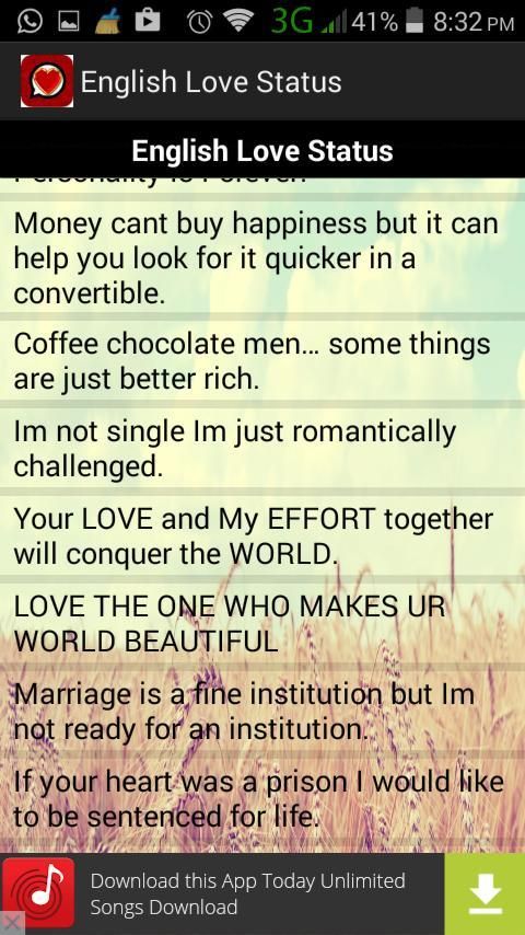 Cari dan download aplikasi ke HP kamu dari toko aplikasi. 20,000+ Pengguna mendownload 2018 ALL Status versi terbaru di 9Apps secara gratis! Ini adalah aplikasi yang sangat bagus dan itu terbukti! Aplikasi HOT ini di rilis tanggal 2017-10-03. Anda bisa download gratis dari 9Apps !