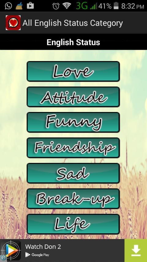 Aplikasi ini meliputi hampir semua kategori pesan status impor seperti