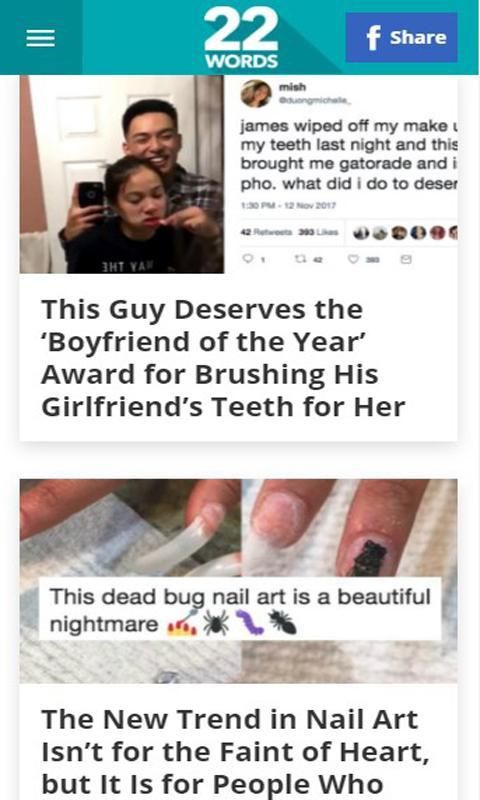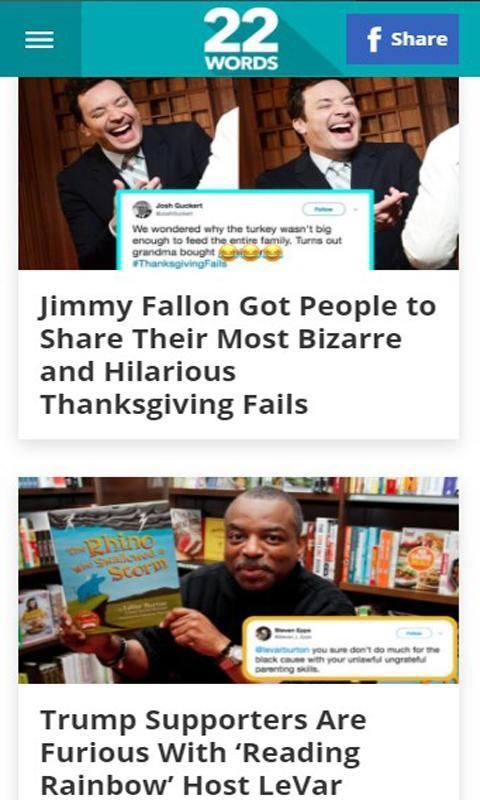 22 Kata-kata mengumpulkan campuran segala sesuatu dari yang serius dan kreatif untuk konyol dan tidak masuk akal. Sebagai sumber Anda untuk sisi gila, penasaran, dan lucu dari web, 22 Kata-kata bisa diandalkan untuk berbagi konten lucu dan menarik virus serta lebih jelas (tapi sama-sama menarik) gambar, video, dan banyak lagi.
