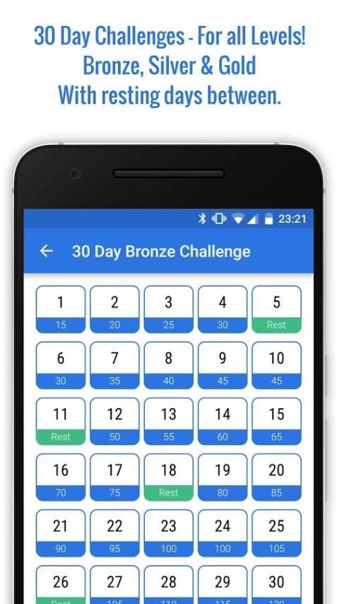 Dalam tantangan Anda memiliki 1 latihan yang harus Anda lakukan setiap hari, dan waktu yang dihabiskan melakukan latihan akan meningkat dari hari ke hari untuk membantu Anda membangun kekuatan otot Anda secara bertahap, dengan hari istirahat beberapa untuk memastikan Anda dapat menyelesaikan hari terakhir tantangan mudah.
