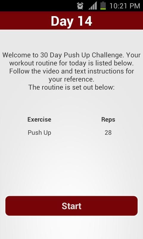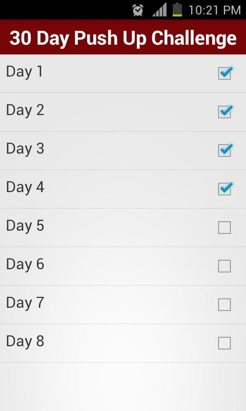 Hanya menginstal aplikasi ini dan mengikuti rutinitas sehari-hari. Pengingat kami secara otomatis akan mengingatkan Anda untuk latihan sehari-hari. Hari libur akan membantu otot Anda pulih. Menandai hari-hari Anda telah menyelesaikan untuk melacak kemajuan tantangan Anda. Jangan menipu! Ini sesederhana itu.
