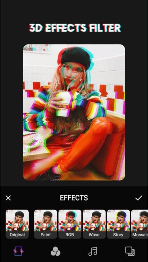 Ada lebih dari 60 opsi untuk pengeditan foto: efek kesalahan, distorsi warna atau piksel, perubahan yang difilter, VHS, blur, struktur seperti grid atau poligon, pemotongan sederhana, dan bahkan lampu sorot