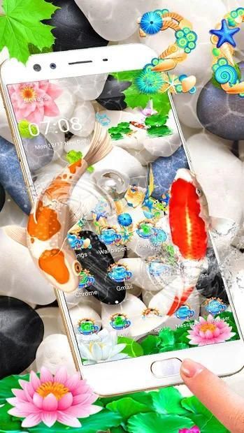 angle swimming on screen to live wallpaper. This is specially recommended for personalize your android phones. White and black stones with beautiful lotus flower on background. 2019 design is decorated by nifty elements for something new. Colorful fishes are swimming. If you touch on screen to swipe or open icons. then, water will ripple.it will look amazing on screen. 3D koi fish lively theme icons are decorated with water wave and sweat ice cream for designing icons. Quickly open the icons and ocean wallpaper, amazing lock screen for you. If you really serious about ocean feeling and you love colorful fish. whatever you want, you can find your wishes in our best theme. We have many themes for fulfil your wishes.so that you always can feel happy. Download this latest 3D Koi Fish Lively Theme. Free for your phone.