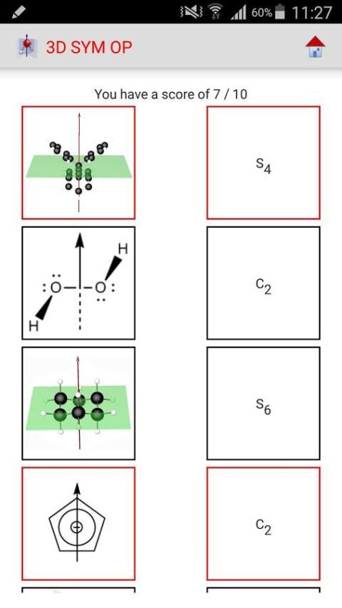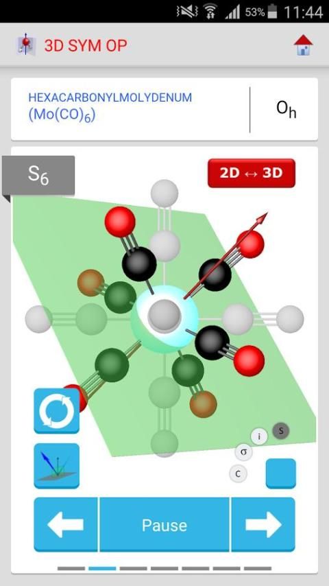"3D Sym Op" adalah sebuah aplikasi pendidikan yang dirancang untuk memvisualisasikan elemen simetri dan operasi pada molekul berbagai kelompok titik. Molekul 3D dicari melalui empat cara: Nama, Formula; Struktur 2D; Titik Group dan Gambar Pengakuan. Elemen simetri - sumbu rotasi (C); Pesawat refleksi (); titik inversi (i) dan rotasi yang tidak benar (S) dapat selektif ditampilkan pada molekul 3D scalable. Pada sentuhan operasi simetri mis C6 - rotasi 60o, dilakukan dan pengguna dapat menghentikan sebentar / melanjutkan gerakan setiap saat. Sesuai gambar 2D dengan elemen simetri juga dapat ditampilkan. Penyadapan grup jalur akan menampilkan tabel karakter. Sebuah mode kuis yang tersedia untuk yang setiap kali memiliki 7 pertanyaan unsur simetri diikuti oleh pertanyaan kelompok 3 titik, untuk penilaian diri.