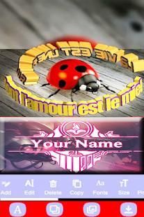 Adding quotes, poetry, name or some thoughts for social media with stickers effects or add name on picks, text on picks with all of these editing features that we discuss in above stickers effect is the combination of flowers, banners, outline borders, hearts and smiles for filtered name, now for every user to love its text style design when he/she 3D Text Maker and editordrawing the text like creating name or quotes or social media post everyone must try background photo effect for text art to design his/her thoughts in a creative way to gain attention and attractions for his post, DP or name specially for social media, In background photo you can choose background theme for your name text to add name on photo with stickers, name filters, texture and colour effects.3D Text Maker and editor