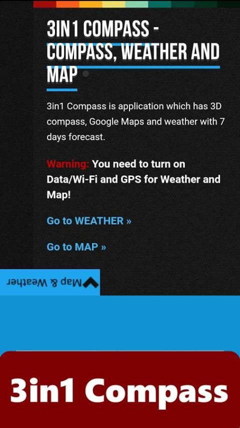 kompas ini adalah gadget yang sangat berguna untuk navigasi dan orientasi yang menunjukkan arah berdasarkan build-in sensor magnetik. Ini juga memiliki cuaca dengan perkiraan 10 hari dan peta untuk lokasi Anda berdasarkan GPS.