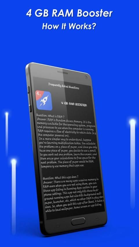 RAM 4 GB Booster membunuh semua aplikasi yang menempati RAM yang terus berjalan di latar belakang serta aplikasi latar depan seperti itu sendiri. Anda juga dapat membunuh 4 GB RAM Booster untuk melepaskan RAM yang ditempati olehnya; yang memberikan peningkatan kecepatan instan dengan membersihkan, mengoptimalkan RAM.