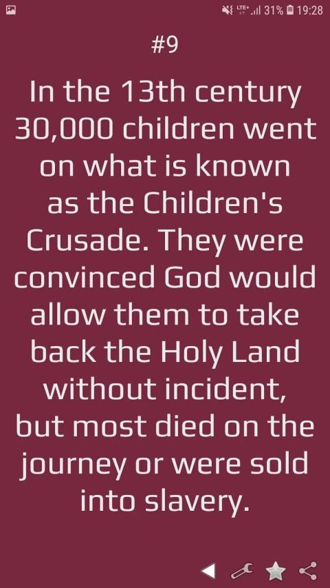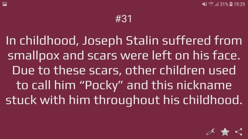 Impress your friends and family with your knowledge about historical facts. Application contains 500 historical facts about ancient empires (Rome, Egypt, Greece,China, Japan), medieval ages, Napoleon wars, US Revolution, Industry Revolution, Civil War, Great War, World War 2, Korean War, Vietnam War and more. Application allows you to choose order of displaying facts (random or by sequence).