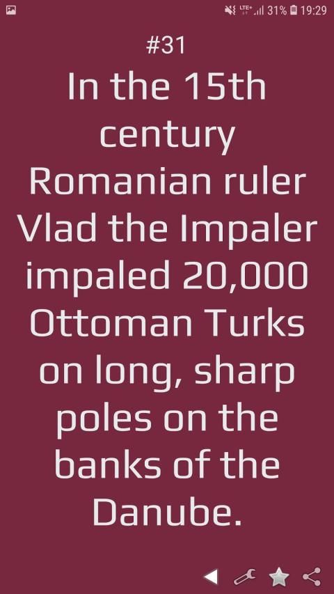 Kesan teman dan keluarga Anda dengan pengetahuan Anda tentang fakta-fakta historis. Aplikasi berisi 500 fakta sejarah tentang kerajaan kuno (Roma, Mesir, Yunani, Cina, Jepang), abad pertengahan, perang Napoleon, Revolusi AS, Revolusi Industri, Perang Saudara, Perang Besar, Perang Dunia 2, Perang Korea, Perang Vietnam, dan banyak lagi. Aplikasi memungkinkan Anda untuk memilih urutan menampilkan fakta (acak atau berurutan).