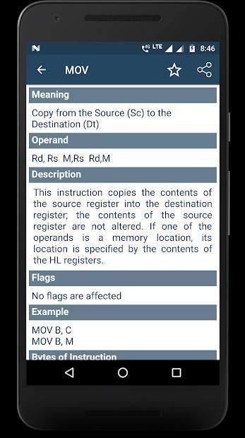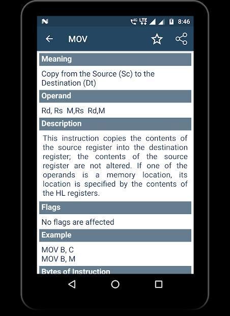 8085/86 Opcodes is an app containing all the instruction set or opcodes of 8085 and 8086 microprocessor. Here opcode detail contains information like meaning of Opcode, Operand (16-bit address or more), brief description of opcode, flags affected while using the opcode, example showing how to use opcode, bytes required to use the instruction/opcode, machine cycle (m-cycle) and t-state require to use the instruction/opcode. Referring to assembly instructions was never so easy before.