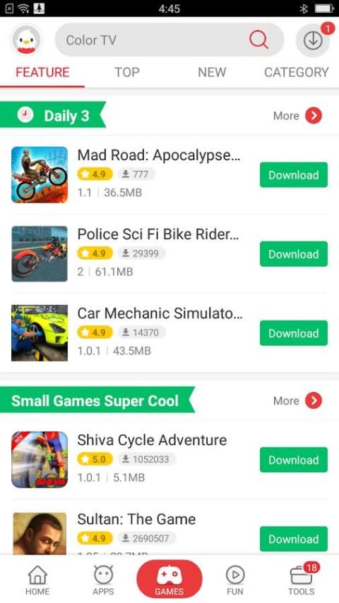 Permainan datang dari semua kategori: Arcade & Action, Otak & Teka-teki, Kartu & Casino, Casual, Racing, dan Olahraga Permainan. Pada tab pertama, "Hot Game" Anda akan menemukan permainan terbaik yang populer sekarang. Dalam satu detik, "Sepanjang waktu Popular", Anda akan menemukan permainan yang telah mendapatkan tempat mereka untuk menjadi favorit semua-waktu banyak pengguna.