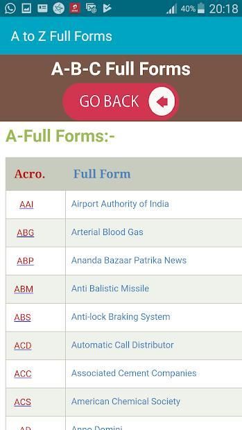 A ke Formulir penuh Z menyediakan semua jenis akronim bentuk penuh. Ini adalah perpustakaan dari semua jenis (A ke Z) bentuk penuh dengan antarmuka yang ramah, ukuran kecil, mudah untuk menggunakan aplikasi benar-benar gratis. Aplikasi ini menyediakan bagian demi bagian (A ke Z) semua jenis Akronim untuk Formulir penuh, sehingga dengan mudah mendapatkan apa yang Anda ingin tahu tentang bentuk penuh. Aplikasi ini pada dasarnya menciptakan bagi India, sehingga Anda mendapatkan Indian semua jenis bentuk penuh dan ya sangat membantu dalam pemeriksaan dan mendapatkan pengetahuan tentang jalan pintas. Kita sering menggunakan beberapa kata dalam kehidupan sehari-hari, tapi kita tidak tahu bentuk penuh mereka.
