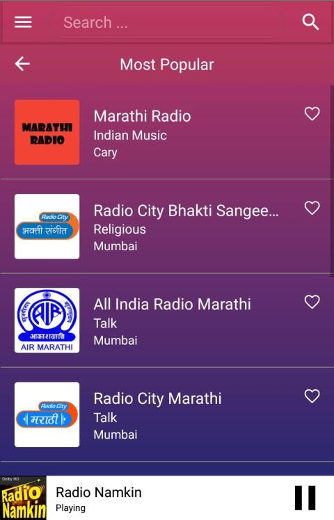 The best collection of online radios and FM radios for Marathi Language. More than 10 Marathi radio stations. This app is loaded with favourites list, sleep timer to auto shutdown FM after a time, sharing with friends, in-built volume control, background playing, retaining last played station on start. Radio stations currently in the app are listed below.