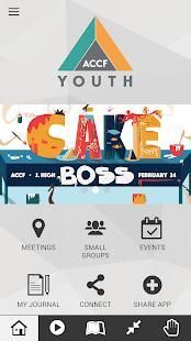 The ACCF Pemuda App adalah alat yang digunakan untuk menyampaikan informasi kepada siswa dan orang tua, media pendeta, dan memberikan kemampuan untuk mendapatkan terhubung dengan kelompok pemuda Athey Creek Christian Fellowship. Siswa dan orang tua dapat mengakses Jr Tinggi dan Sekolah Tinggi acara info dan mendaftar bentuk, ikuti panduan belajar dan membaca rencana yang berkoordinasi dengan ajaran-ajaran dari pertemuan pemuda, dan mendengarkan ajaran-ajaran direkam dan media.