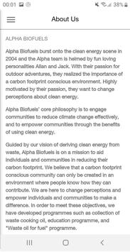 Aplikasi yang dirancang untuk seluruh rantai logistik untuk pembuangan etika dan berkelanjutan dari minyak goreng bekas di Singapura.Dikembangkan oleh Alpha Biofuels (S) Pte Ltd