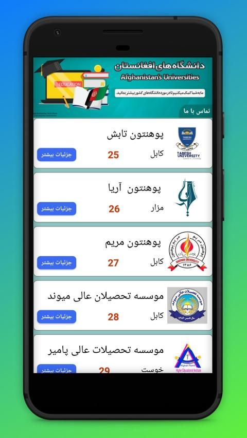 9Apps يقدم تحميل كمية هائلة من التطبيقات العربية 20,000+ مستحدمين يحملون AfghanUniversities احدث الاصدار مجانا كل أسبوع في هذه التطبيقات تتلقى ترحيبا حارا في المنطقة العربية..9Apps هذه التطبيق الحلوووه تصدر في 2019-03-25 لو يعجبك فتقوم بالتحميل والتمتع به..