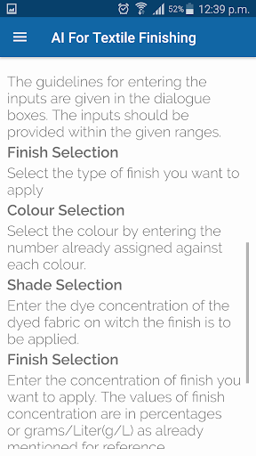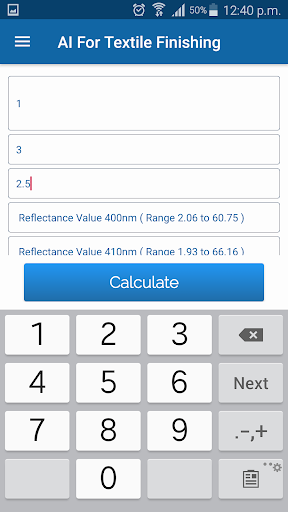 Aplikasi ini bekerja dengan 20 jaringan saraf tiruan terlatih.Jaringan-jaringan ini dilatih dengan menggunakan data eksperimen / industri dunia nyata.Pengguna harus memasukkan nilai-nilai reflektansi dari kain yang dicelup