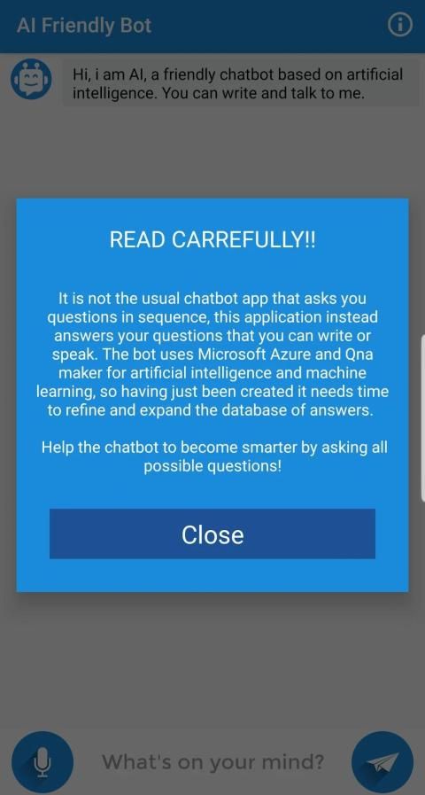 It is not the usual chatbot app that asks you questions in sequence, this application instead answers your questions. You can write or talk to ask a question and the bot will answer you.