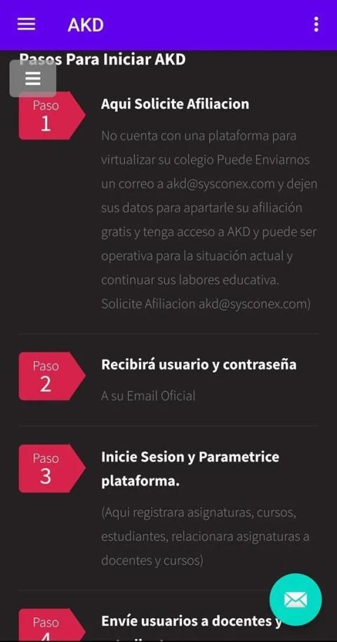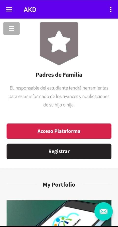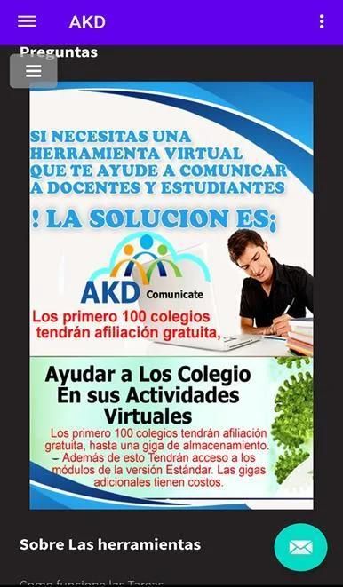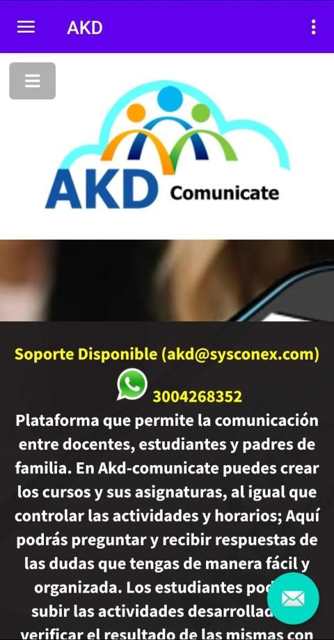 Plataforma que permite la comunicación entre docentes, estudiantes y padres de familia. En Akd-comunicate puedes crear los cursos y sus asignaturas, al igual que controlar las actividades y horarios; Aquí podrás preguntar y recibir respuestas de las dudas que tengas de manera fácil y organizada. Los estudiantes podrán subir las actividades desarrolladas y verificar el resultado de las mismas con las recomendaciones que le haya indicado el docente. Con Akd-comunicate el colegio podrá colgar sus noticias y comunicados, el docente podrá responder de manera fácil las dudas que tengan sus estudiantes, también verificara el horario respectivo y el estudiante será notificado sobre cuándo debe entregar las actividades programadas. Akd-comunicate más que una APP será un asistente personal para todos sus usuarios.