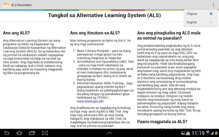 ALS Alternatif Learning (COL) adalah sebuah aplikasi Android untuk siswa dari Departemen Pendidikan (DepEd) Biro Sistem Pembelajaran Alternatif (BALS). Hal ini bertujuan untuk membantu lulus DepEd bermaksud untuk mengambil BALS Akreditasi & Kesetaraan (A & E) Test, tes yang dapat memberikan setara dengan ijazah sekolah tinggi untuk out-of-sekolah. Salah satu "Rakyat Champ" Manny Pacquiao dikenal itu berlalu.