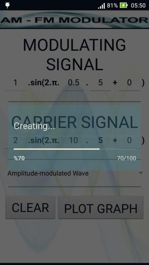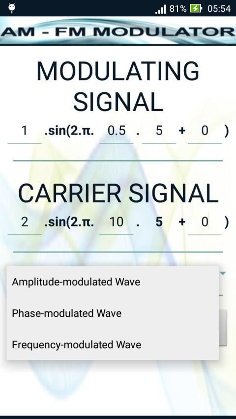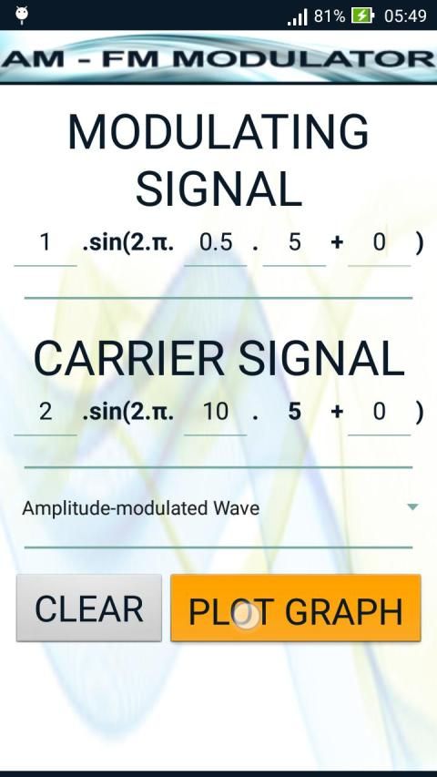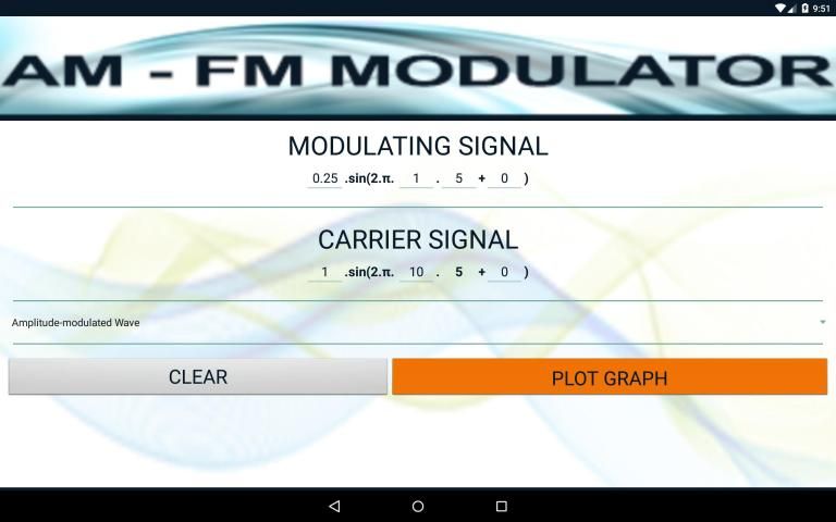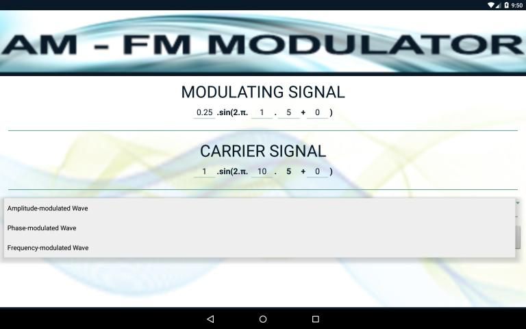 AM-FM Modulator adalah modulator gelombang dan skets grafik. Ada sinyal Model whic dapat disebut baik data atau sinyal modulasi dan juga sinyal pembawa. Anda dapat mengatur nilai-nilai sinyal seperti Amplitudo, Frekuensi, Fase dan interval waktu yang akan menunjukkan grafik.